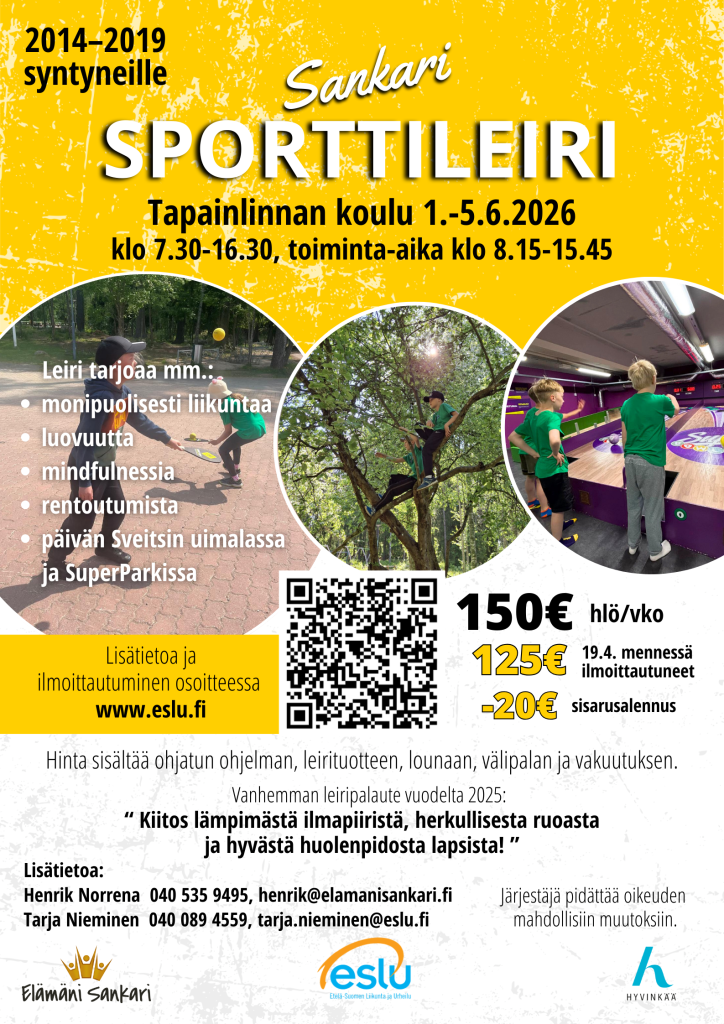 Kesä alkaa perinteisesti Hyvinkään SankariSporttileirillä! Kesän 2026 aikana järjestetään yksi leiri Tapainlinnan koululla 1.-5.6.2026.
